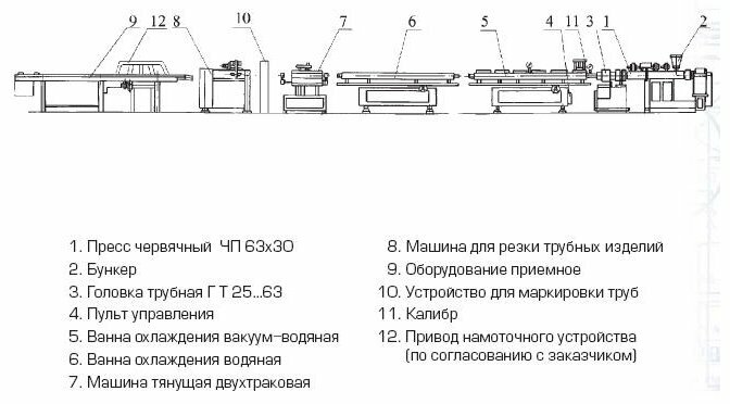 Линия предназначена для производства труб из гранулированного полиэтилена, полипропилена диаметром от 25 до 110 мм, применяемых в отраслях водогазоэнергоснабжения, для крупнопанельного домостроения, строительства промышленных предприятий (для изготовления сантехнических изделий, канализационных сетей, туннельной прокладки кабеля и проводов).