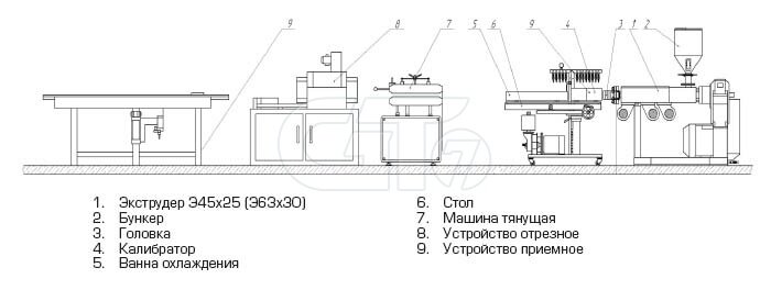 Линия для получения профиля из ПВХ, предназначена для переработки гранулированных полимерных (ПВХ) материалов в изделия: плинтуса, кабель-каналы, облицовочные профили и т.д. Линия производится на базе экструдера Э45х25 (или экструдера Э63х30М).
